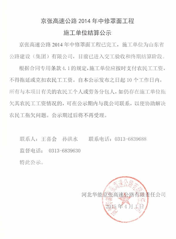京張高速公路2014年中修罩面工程施工單位結算公示