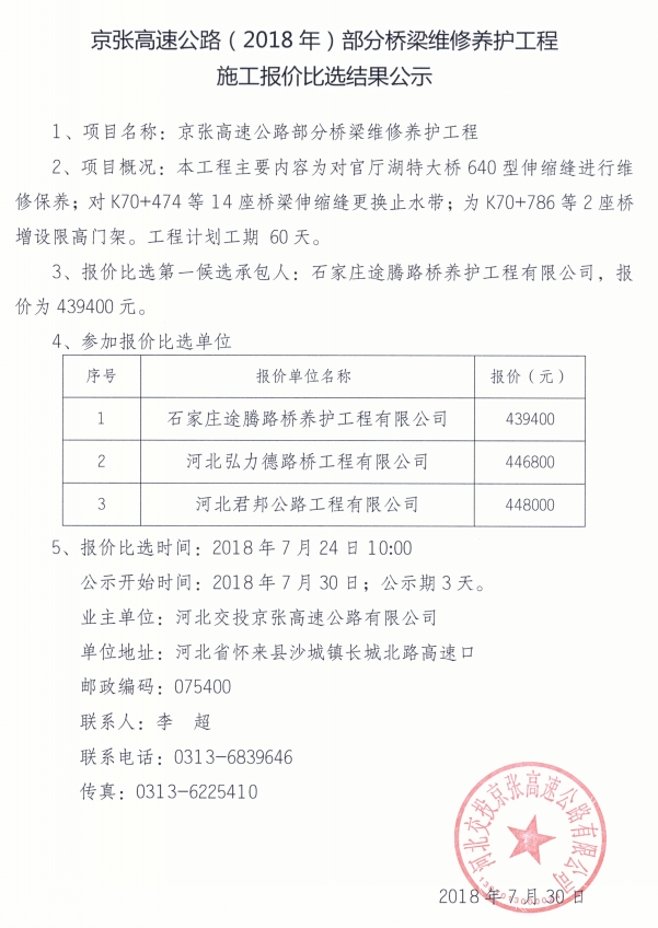京張高速公路(2018年)部分橋梁維修養(yǎng)護(hù)工程施工報價比選結(jié)果公示