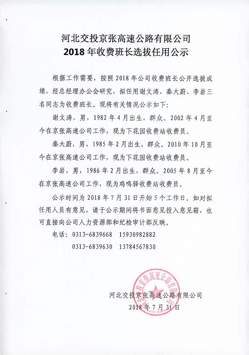 公司2018年收費班長選拔任用公示