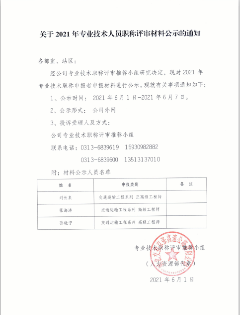 關(guān)于2021年專業(yè)技術(shù)人員職稱評審材料公示的通知